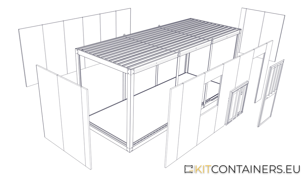 Onze kitcontainers worden geleverd als complete assemblagekits. Het basisframe, dak en vloer zijn vooraf gemonteerd. Het dak wordt opgetild, pilaren bevestigd en wanden, ramen en deuren geïnstalleerd. Daarnaast bieden wij een breed scala aan accessoires en installatiesystemen: